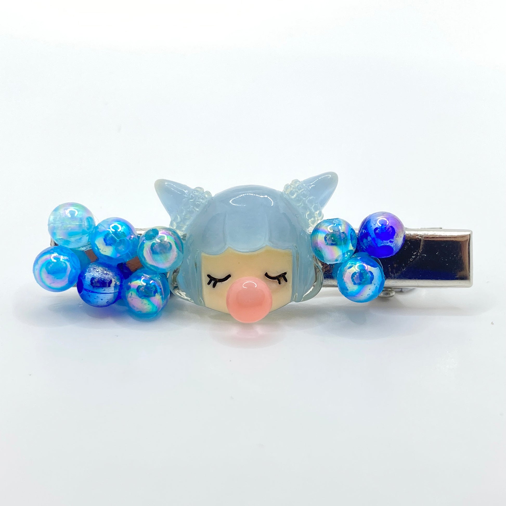 BubbleGirl_Blue, Alligator Silver Clip Girl Blow Bubble with Bed of Bubbles.