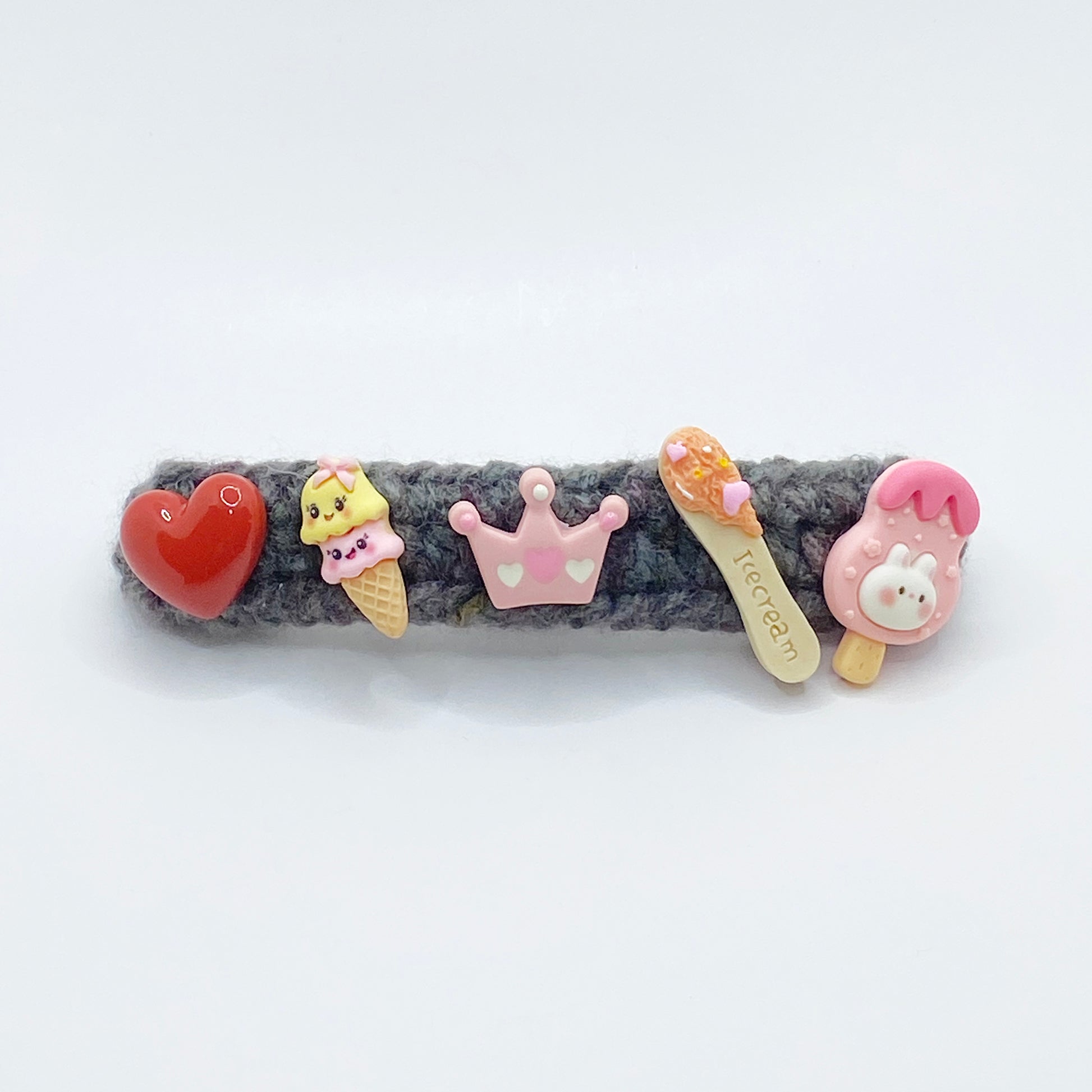 Crochet Base, French Barrette, Grey crochet base with Hear, Crown and 3 types of Ice-Cream.
