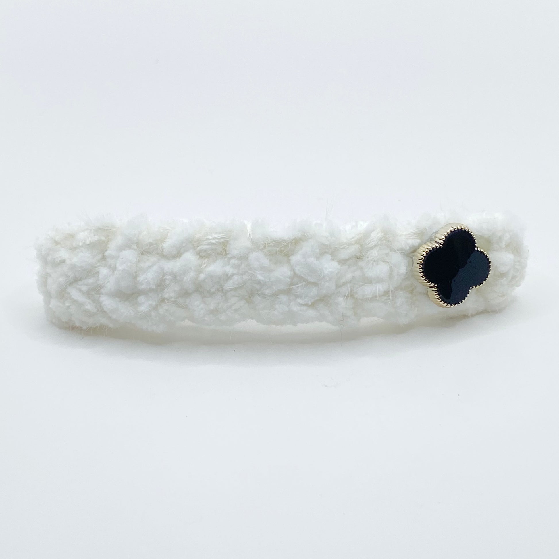 Classy Crochet Base, French Barrette, White crochet texture base and Black with Gold Trimming Four Leaf. Excellent piece to make a statement!