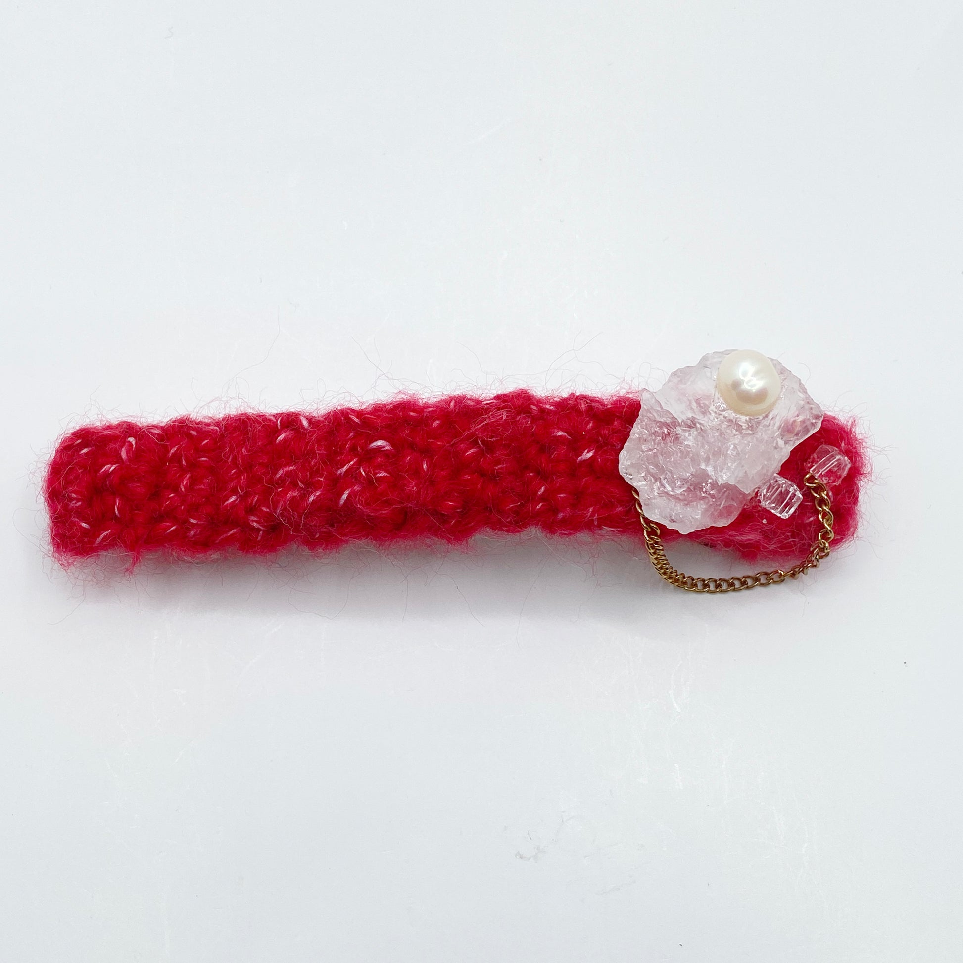 Classy Crochet Base, French Barrette, Red crochet texture base with a 8.5mm Fresh Water Pearl sitting on Clear Quartz. Decorated with Glass cube crystal beads and Gold Chain. Excellent piece to make a statement!