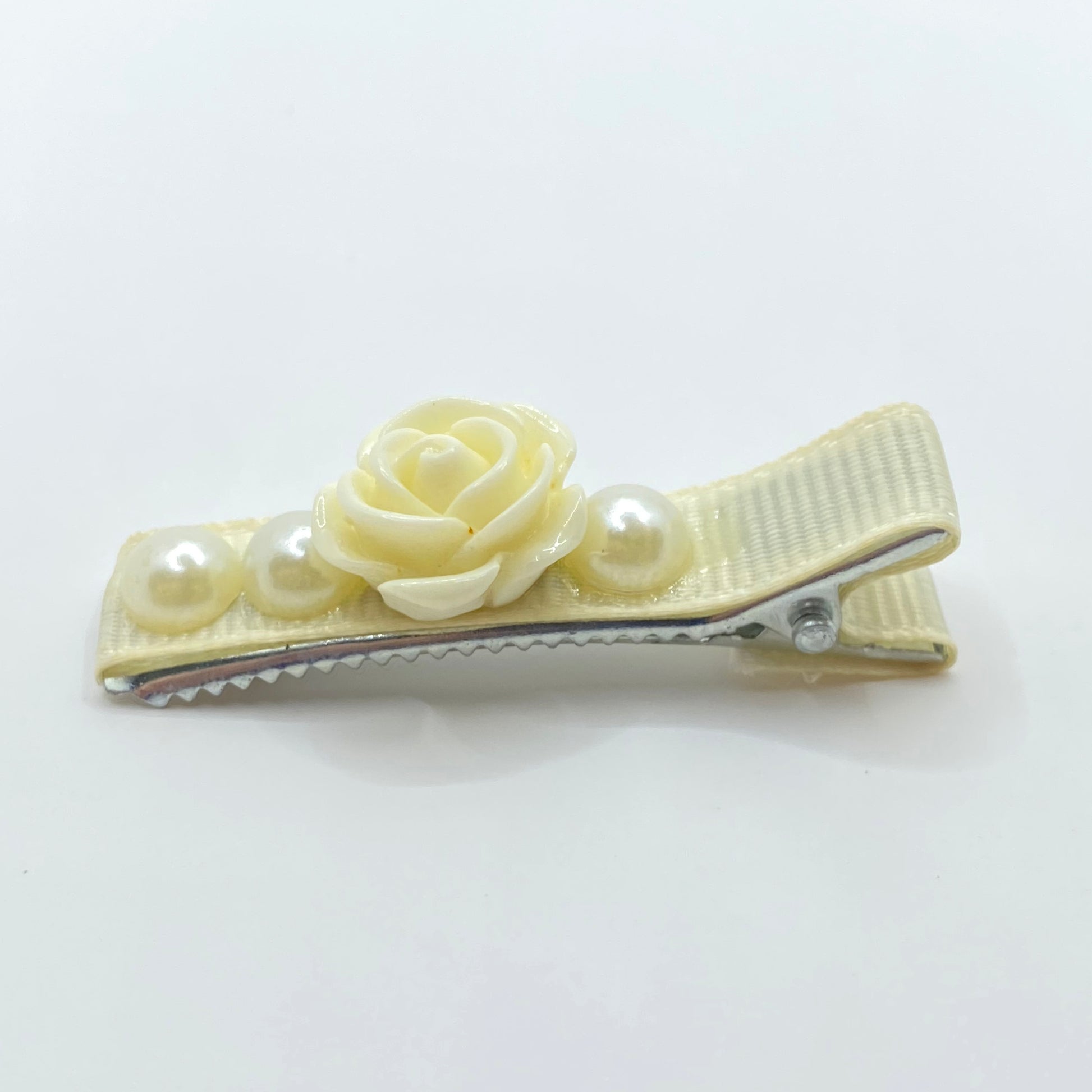 RoseBeads, Alligator Ivory Fabric Clip with Ivory Rose and Semi PVC Pearl Beads