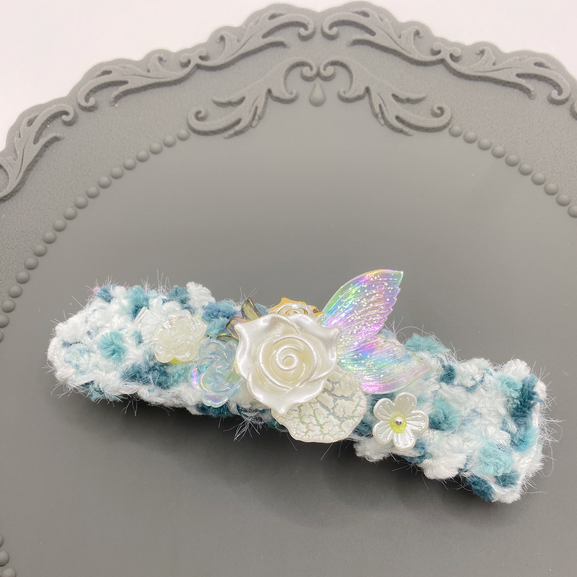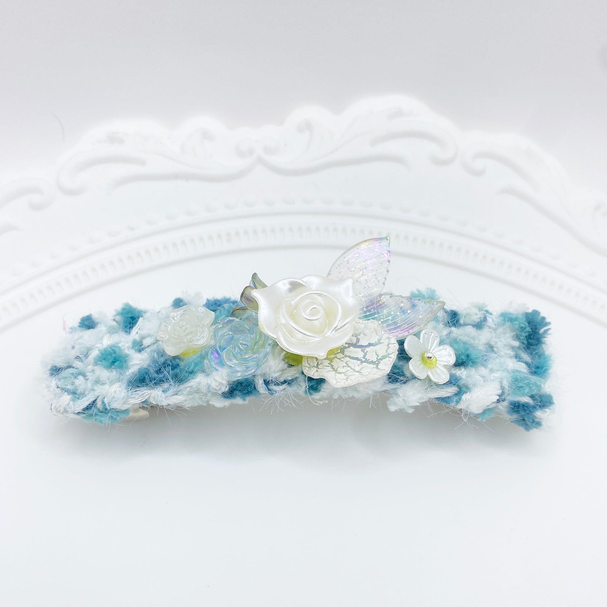 Classy Crochet Base, French Barrette, Shades of Green and white crochet texture base with Roses and leaves and mermaid tail. Excellent piece to make a statement!